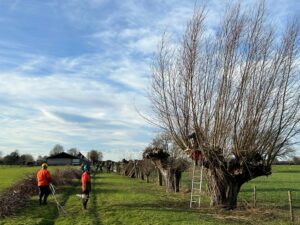 Daar zijn deze maand de laatste van ruim veertig wilgen geknot, nadat een paar jonge vaders er vijftig jaar geleden, in 1973, mee zijn begonnen. Zij woonden allen aan de Achtersloot. Via de school van hun kinderen sloten zich meer vaders en moeders aan die het leuk vonden om bezig te zijn in de natuur. Met een vaste kern van ruim tien vrijwilligers worden nog steeds met enthousiasme wilgen geknot en waar noodzakelijk gerooid.